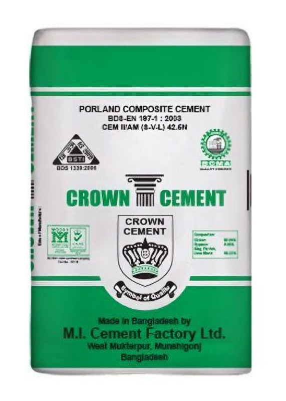 Crown Portland Composite Cement is CEM-II/A-M which is a cement consisting of Clinker, Gypsum, Pulverized Fuel Ash (PFA), Blast Furnace Slag and Limestone designated by the recommendation of BDS EN 197-1: 2010; CEM -II/A-M (V-S-L), 42.5 N. PCC is the most suitable cement for constructions in Bangladesh.